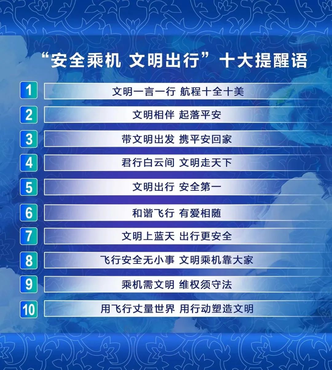 根据网络投票结果,“安全乘机 文明出行”十大提醒语分别为:“文明一言一行 航程十全十美”“文明相伴 起落平安”“带文明出发 携平安回家”“君行白云间 文明走天下”“文明出行 安全第一”“和谐飞行 有爱相随”“文明上蓝天 出行更安全”“飞行安全无小事 文明乘机靠大家”“乘机需文明 维权须守法”“用飞行丈量世界 用行动塑造文明”。