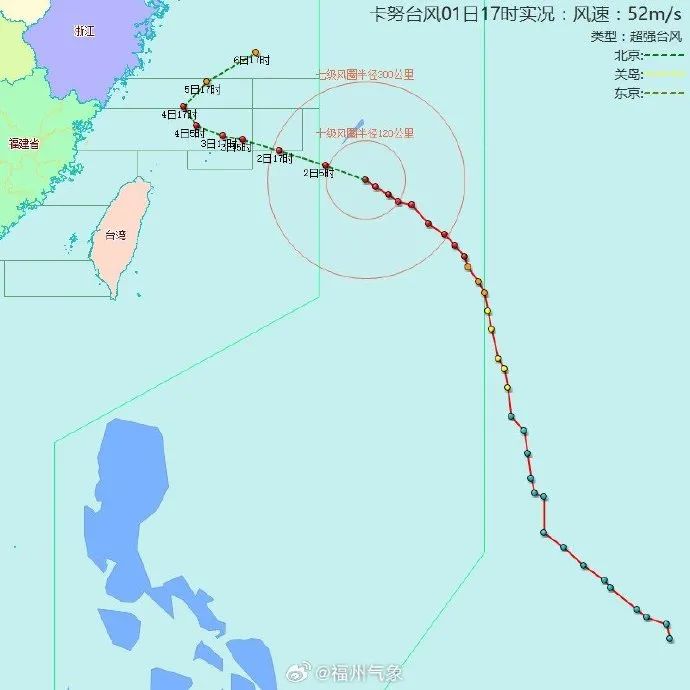 根据目前预报,“卡努”将以每小时15公里至20公里的速度向西北方向移动,强度还将有所增强,并向琉球群岛南部海域靠近,8月2日上午移入东海,然后逐渐向浙江中部至福建北部一带沿海靠近。