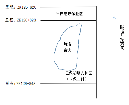 1、事故现场发生在山头坪隧道左洞ZK126+823-ZK126+845位置,该段2019年4月6日上午7:35左右,发生脆性破坏造成坍塌,该处围岩为微风化晶屑熔结凝灰岩,为较硬岩-坚硬岩,节理裂隙发育,岩体较破碎-较完整,呈镶嵌碎裂结构,其中有2组裂隙带对围岩稳定影响较大,1组走向近平行于洞轴线,倾向约20°,倾角约45~50°,裂隙间距约1.0~2.0米,另1组走向近平行于洞轴线,倾向约200°,倾角约40°~45°,裂面间距约0.5~1.0米,裂隙面光滑平直,结合一般,这两组不利裂隙带组合造成拱顶产生局部坍塌,塌腔约长25米、宽15米、深5米,坍塌处位于梨山组砂岩与南园组凝灰熔岩接触带附近。坠落石块呈锅盖形(凸起)表面未见显现旧裂痕,呈不规则脆性状(见附图一、二),事故点为初期支护完成但二衬尚未施工,当日正在进行的湿喷作业区旁(见附图三)。