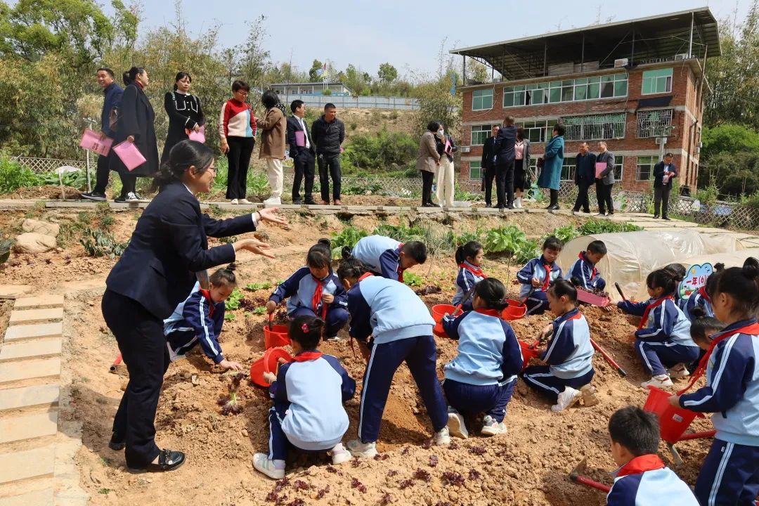 在“躬耕园”,与会人员参观了耕读廊和各学段学生的劳动种植区,观摩了张剑丹、张兴辉两位老师指导的劳动实践课,欣赏了三年级、五年级孩子们春意盎然的劳动场面。